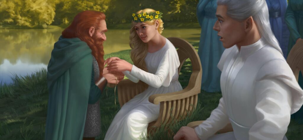 Quando, então, ela oferece não um, mas três fios a um anão, ser de uma raça com um enorme histórico de desamor mutuo, estamos diante de uma inversão histórica. O que foi negado ao elfo mais brilhante e orgulhoso dos Noldor é concedido a alguém que representa um povo tradicionalmente desconfiado dos elfos e por vezes visto como inferior. O gesto parece ajudar a curar uma ferida antiga.