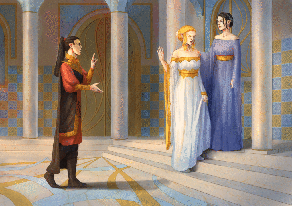 A força desse presente está menos na materialidade do cabelo e mais no que ele simboliza. Tolkien descreve os cabelos de Galadriel como capturando a luz das Duas Árvores de Valinor, Laurelin e Telperion. Não é um detalhe estético; é, quase literalmente, uma herança metafísica. Neles repousa um eco da luz primordial do mundo. Não por acaso, milênios antes, Fëanor, o maior artífice dos Noldor e criador das Silmarils, pedira a Galadriel uma mecha de seus cabelos. Ela recusou. Três vezes, segundo os contos reunidos em Contos Inacabados. A negativa de Galadriel, não vem de um capricho, ela possivelmente percebia em Fëanor a chama de possessividade, a mesma que incendiaria o mundo e que poderia ter condenado todos os elfos.